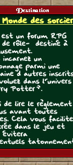 "Le monde des sorciers / Pré au Lard RPG " ont étés créés le 01/04/2004 et est © Ambrosius Kallahan / Kalrin Melvel'en. Toute reproduction, même partielle est interdite sans l'accord d'un Webmaster. Harry Potter appartient à J.K.Rowling. Nous ne tirons aucun profit de ce site, il est exclusivement un divertissement.
